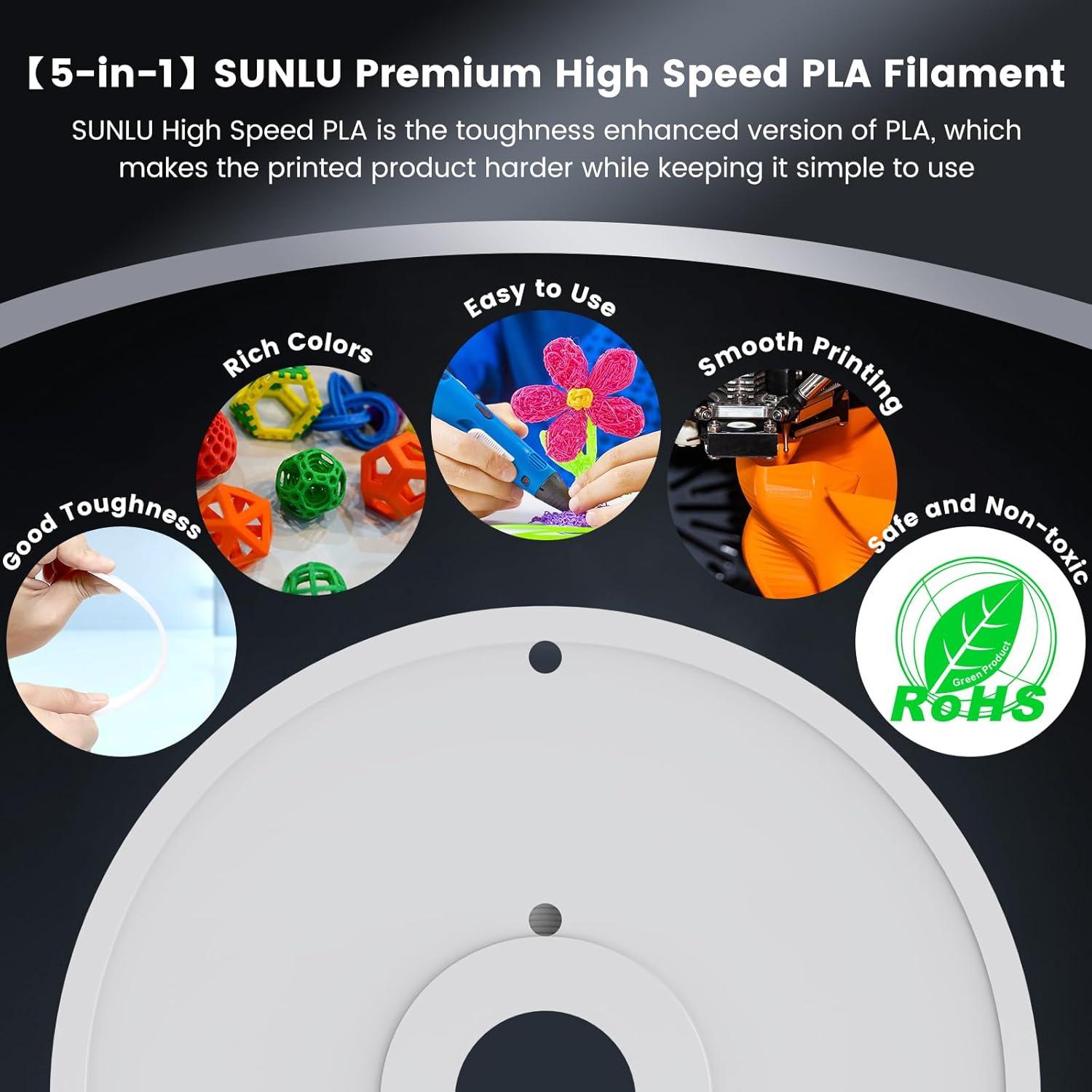 ①【Print Faster】 -SUNLU high-speed 3D printer PLA filament, designed to turbocharge your printing from slow to swift. Experience a colossal 500% increase in flowability, ensuring smooth printing even at speeds exceeding 250mm/s, without clogs or filament shortages. Bring your ideas to life with high-speed printing, on average, save 70% printing time.