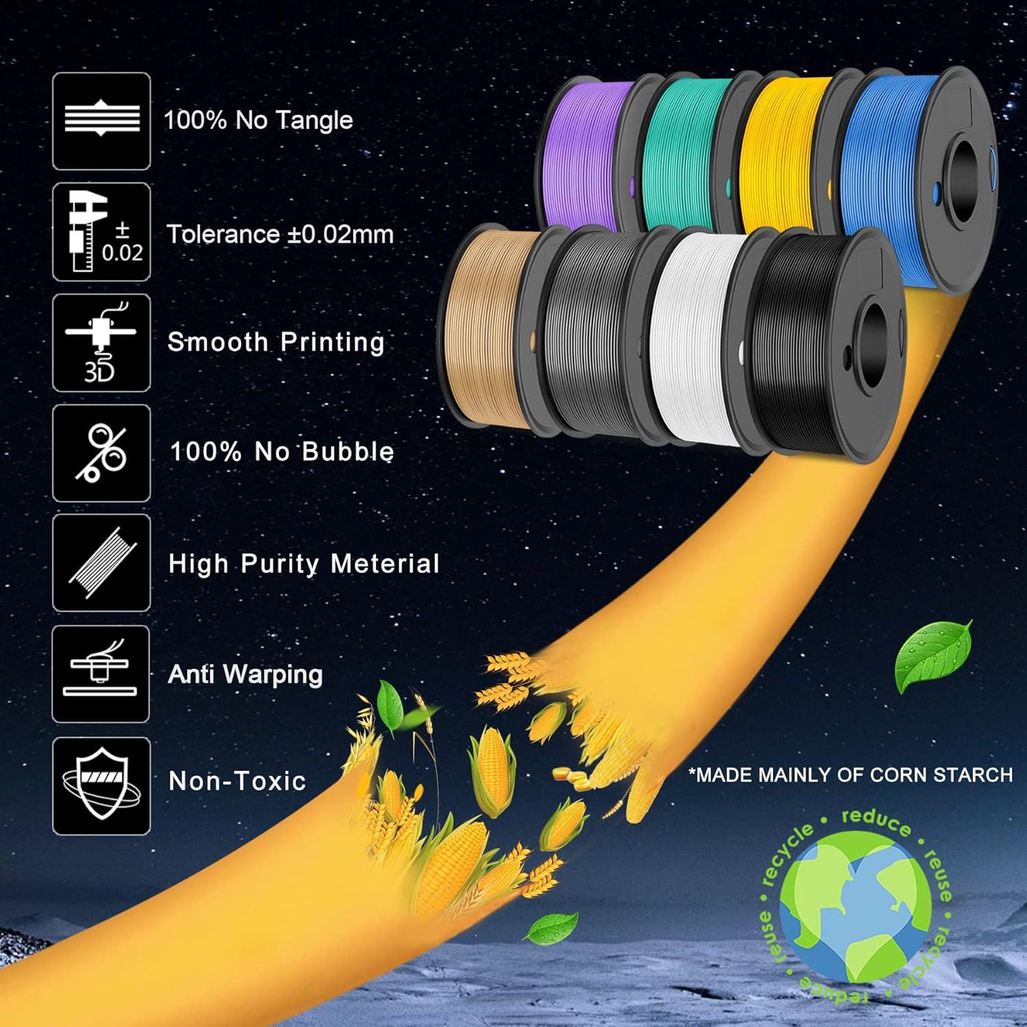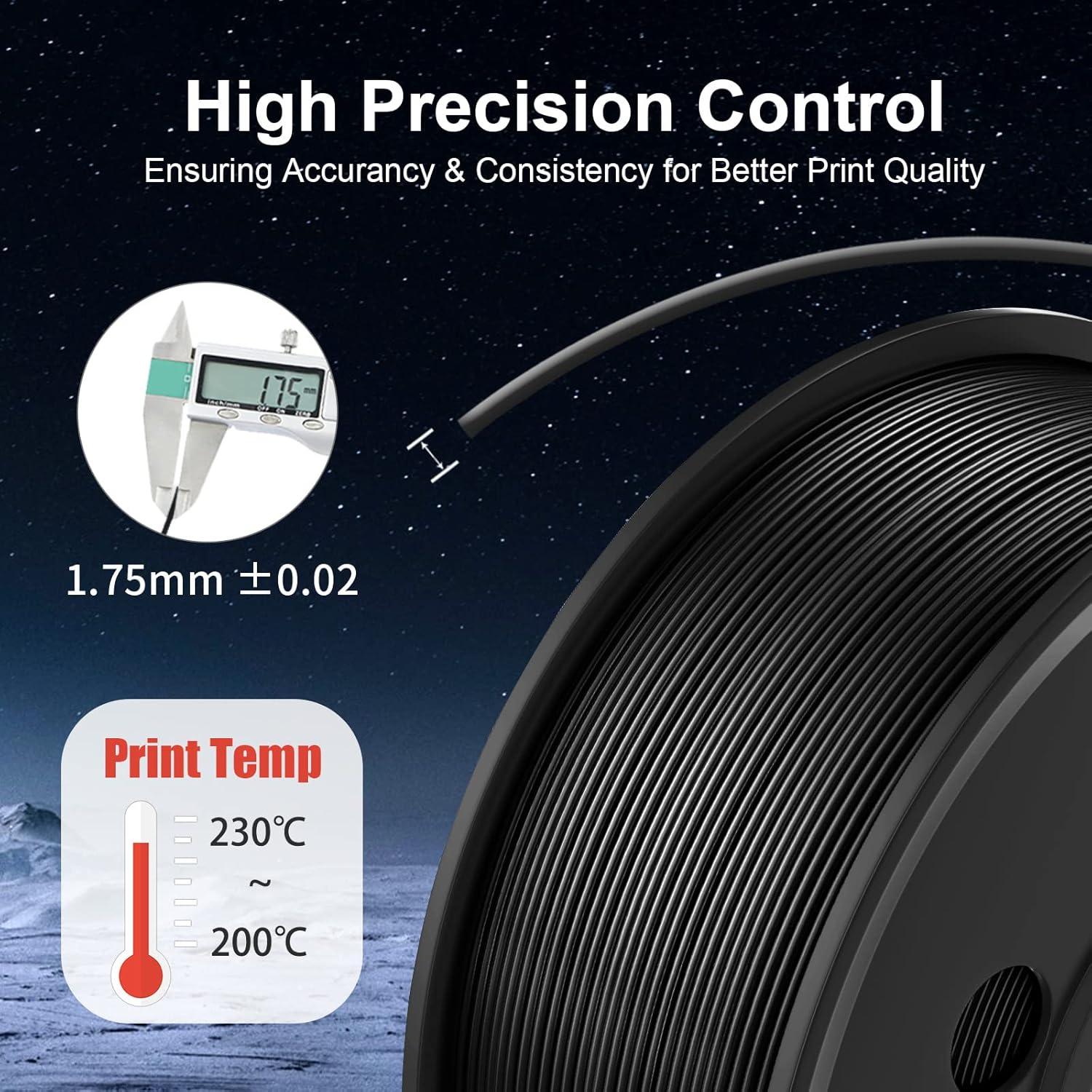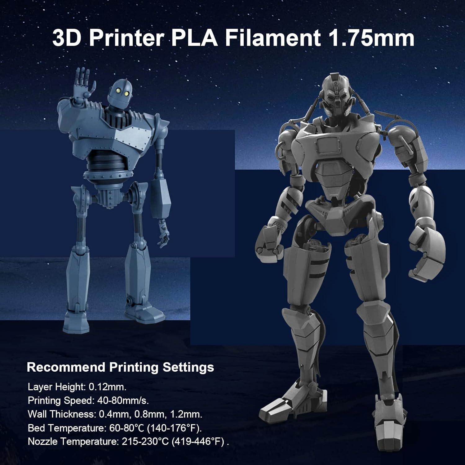 【Recommend Settings】We recommend printing the PLA filament at nozzle temperature of 210-240°C, bed temperature of 50-60°C, and printing speed of 50-200mm/s.