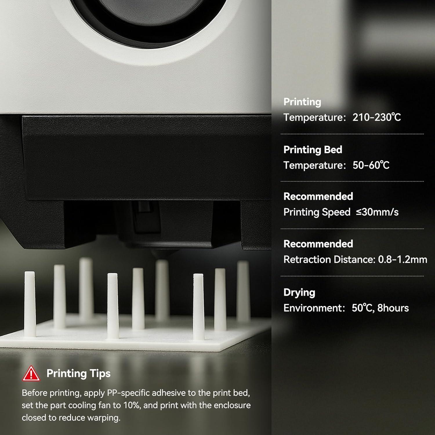②【Printing Tips】To minimise warping, we recommend drying the material for 8 hours at 50°C prior to printing. Apply PP adhesive to the print bed, operate the component fan at 10% power, and print with the enclosure sealed.