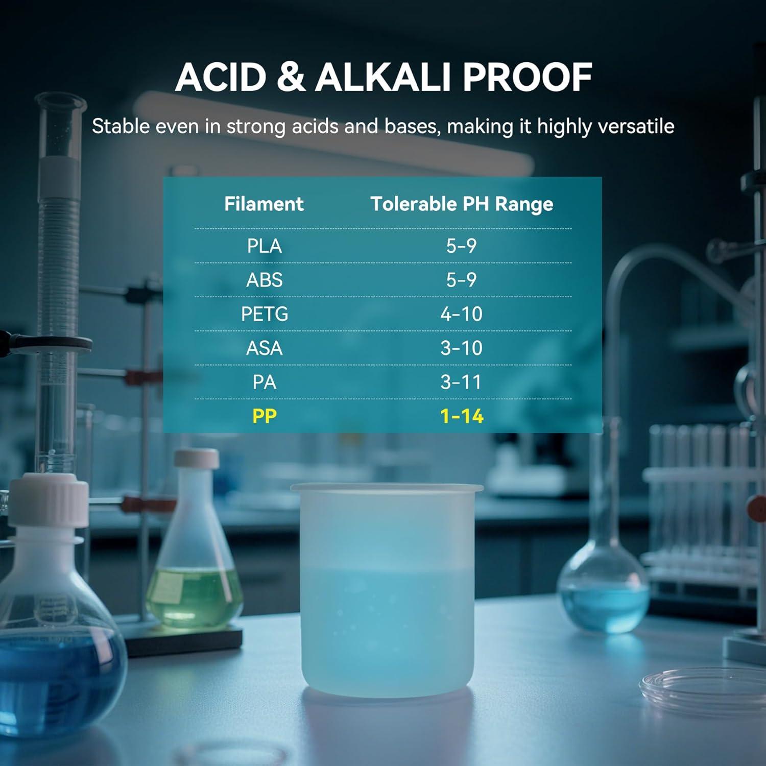 ④【Chemical Resistance】Polypropylene exhibits exceptional resistance to corrosion from various chemical solvents, remaining unaffected by damage, deformation, or melting in environments containing strong acids and alkalis (pH 0.5–14). This ensures printed components maintain structural integrity and dimensional stability even when exposed to corrosive substances.