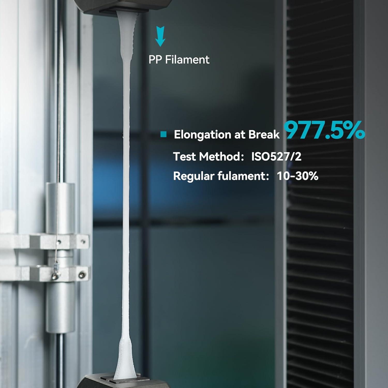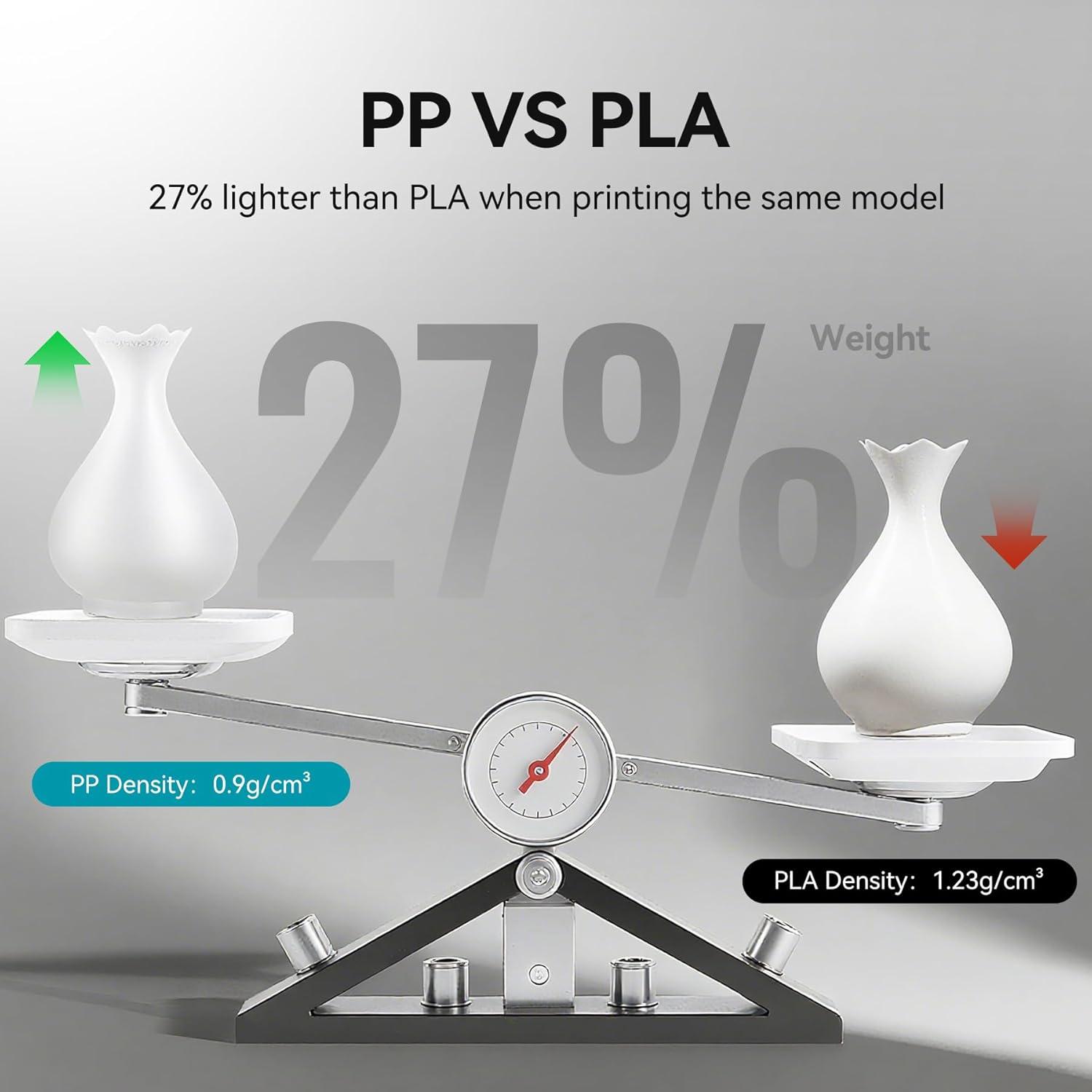 ③【Low Density & Lightweight】PP Filament is a flexible material characterised by its low density (0.9 g/cm³) and lightweight properties, effectively reducing product weight. Printed models made from PP are approximately 27% lighter than those made from PLA. It is suitable for drone components, automotive parts, and other lightweight engineering components.